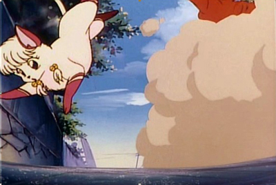 This happens right after Akane gets jealous seeing Shampoo snuggling Ranma and in a fit she throws cold water at them. Of course, Ranma-chan freaks out about the cat transformation and lunges kitty Shampy into the air LMAO! Classic Ranma moment! Love it XD